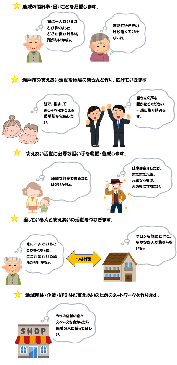 瀬戸市社会福祉協議会では、地域における高齢者の生活支援・介護予防の体制整備を推進していくために、体制整備に向けた調整役として、市より委託を受け、平成28年5月から生活支援体制整備事業における「生活支援コーディネーター」を配置しています。