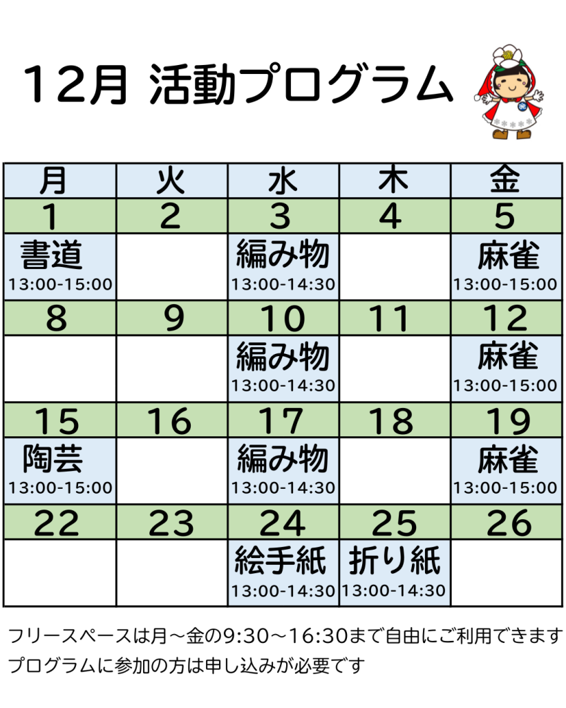 寒さが深まるなか、今年も残りわずかとなってきました。今月も無理のないペースで楽しめるプログラムをそろえています。「ちょっと気分転換したいな」「少しだけ参加してみようかな」と思ったときに、どうぞ気軽にお越しください。ご不明な点がございましたらお問い合わせください。
