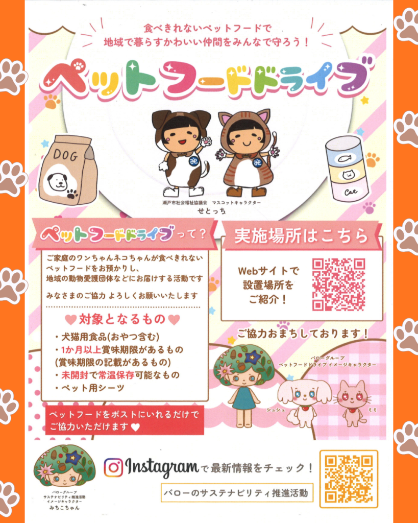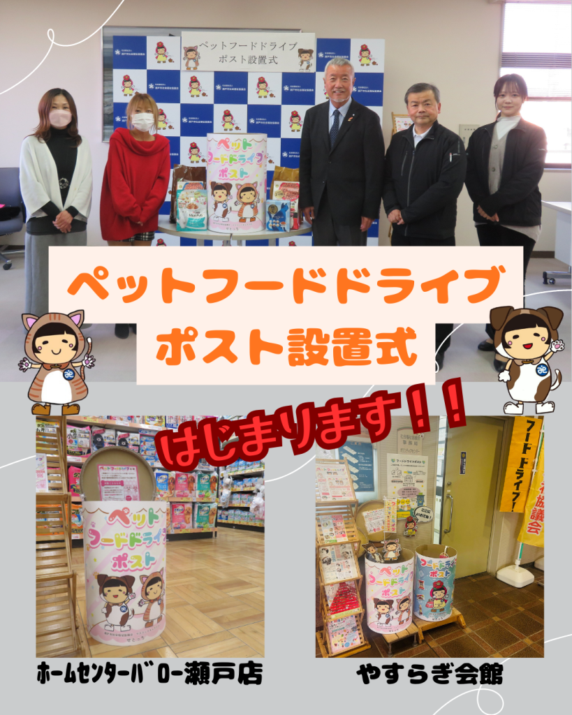 | 令和8年2月17日(火)、ペットフードドライブポスト設置式を行いました。 本会では、昨年より、食品ロス削減と地域支援を目的に、株式会社バローホールディング様とともにフードドライブを開始し、12月には新事業「せとっちのきもち」にもご協力いただくなど、連携を深めてまいりました。 この度、新たに、ご家庭で余っている賞味期限内のペットフードを地域の皆さまから寄付していただき、動物保護団体へ届ける取り組みを実施することになりました。 令和8年2月17日より、「やすらぎ会館」と「ホームセンターバロー瀬戸店」にポストを設置します。寄付していただいたペットフードは、市内で動物保護活動に取り組む「瀬戸地域ねこの会」および「非営利団体ちーむにゃいんず」へ寄付し、保護犬・保護猫の命をつなぐ支援物資として活用されます。 対象となるものは、以下のとおりです。 ①犬猫用食品 ②1か月以上賞味期限があるもの(賞味期限の記載があるもの) ③未開封で常温保存可能なもの ④ペット用シーツ この取り組みがフードロス削減だけでなく、保護動物への理解促進に加え、動物愛護 団体の活動が継続的に行えるように実施してまいりたいと思います。 今後も、皆さまのご協力をよろしくお願いいたします。 |