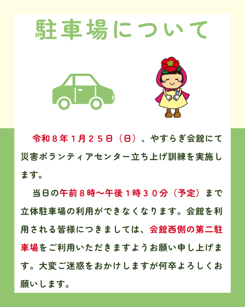 | 令和8年1月25日(日)、やすらぎ会館にて災害ボランティアセンター立ち上げ訓練を実施します。 当日の午前8時~午後1時30分(予定)まで立体駐車場の利用ができなくなります。 会館を利用される皆様につきましては、会館西側の第二駐車場をご利用いただきますようお願い申し上げます。 大変ご迷惑をおかけしますが何卒よろしくお願いします。 |