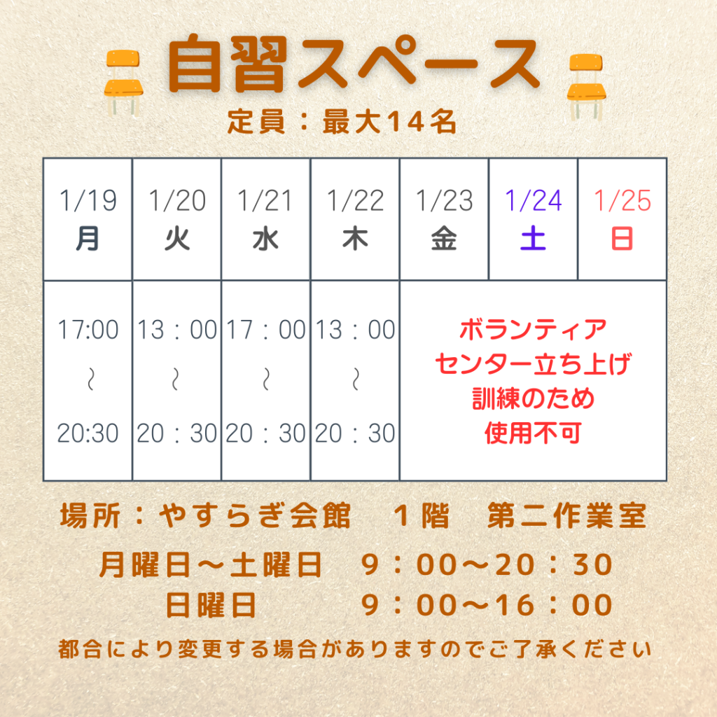 1/19~1/25の自習スペース利用のご案内です。読書や自習時間としてご利用ください。