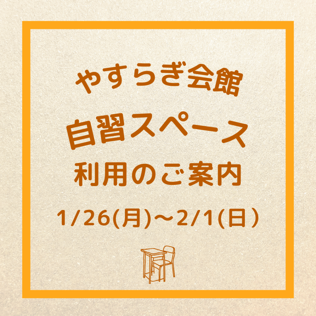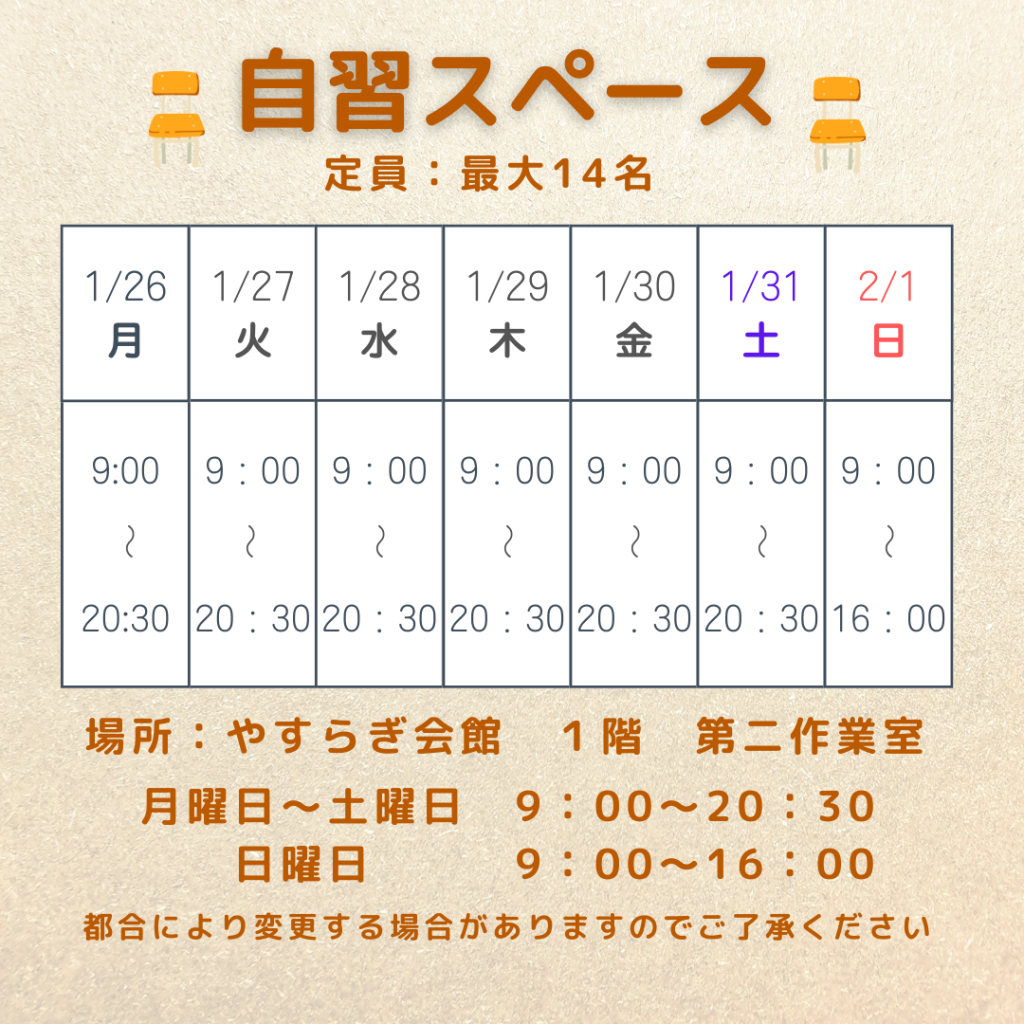1/26~2/1の自習スペース利用のご案内です。読書や自習時間としてご利用ください。