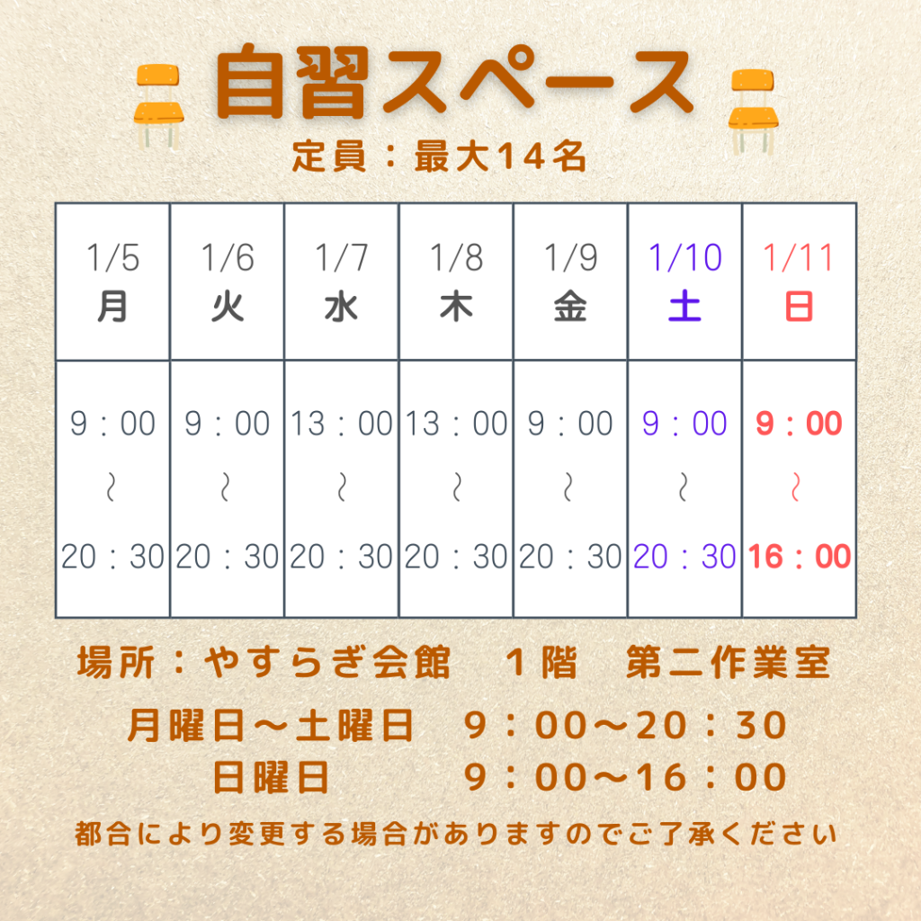 1/5~1/11の自習スペース利用のご案内です。読書や自習時間としてご利用ください。