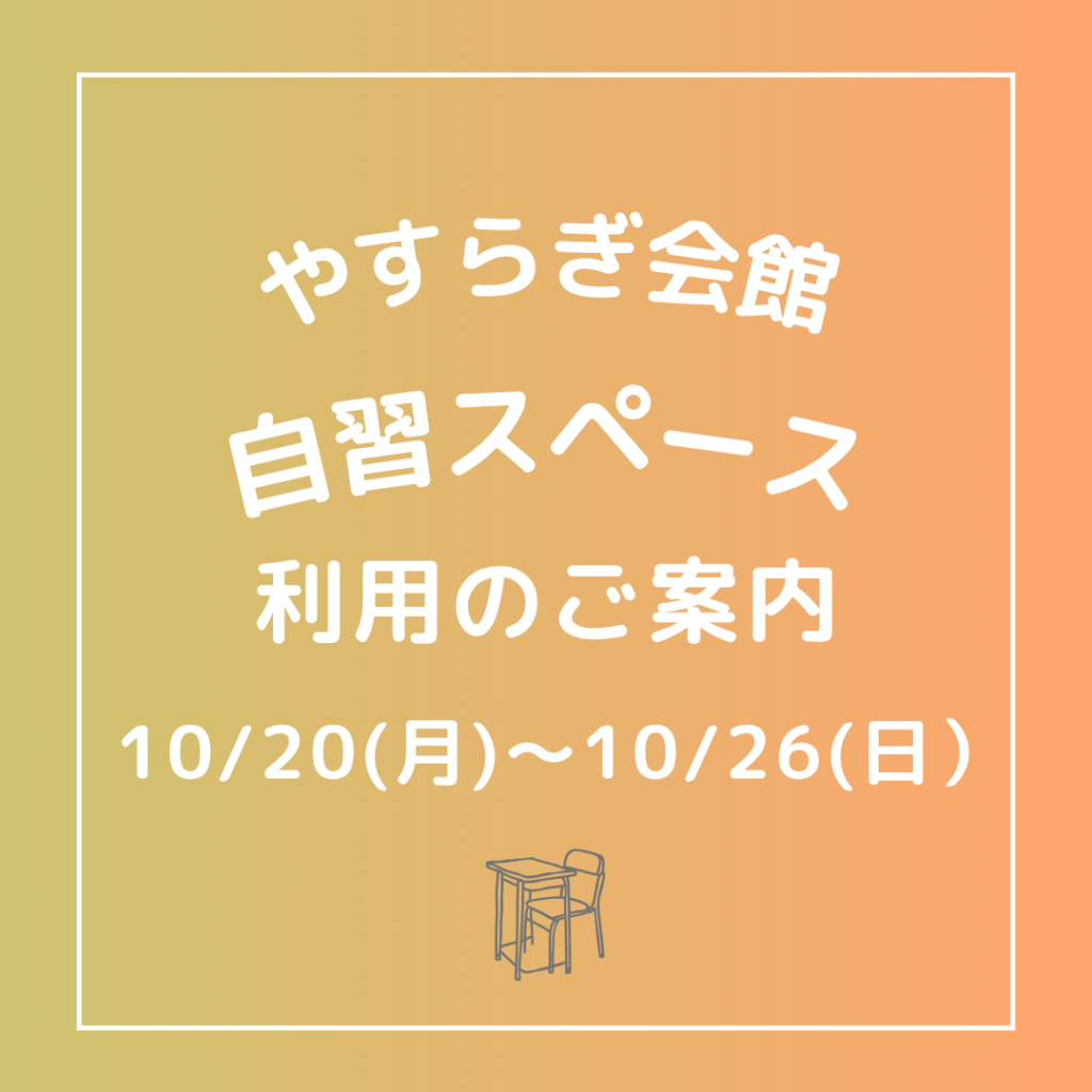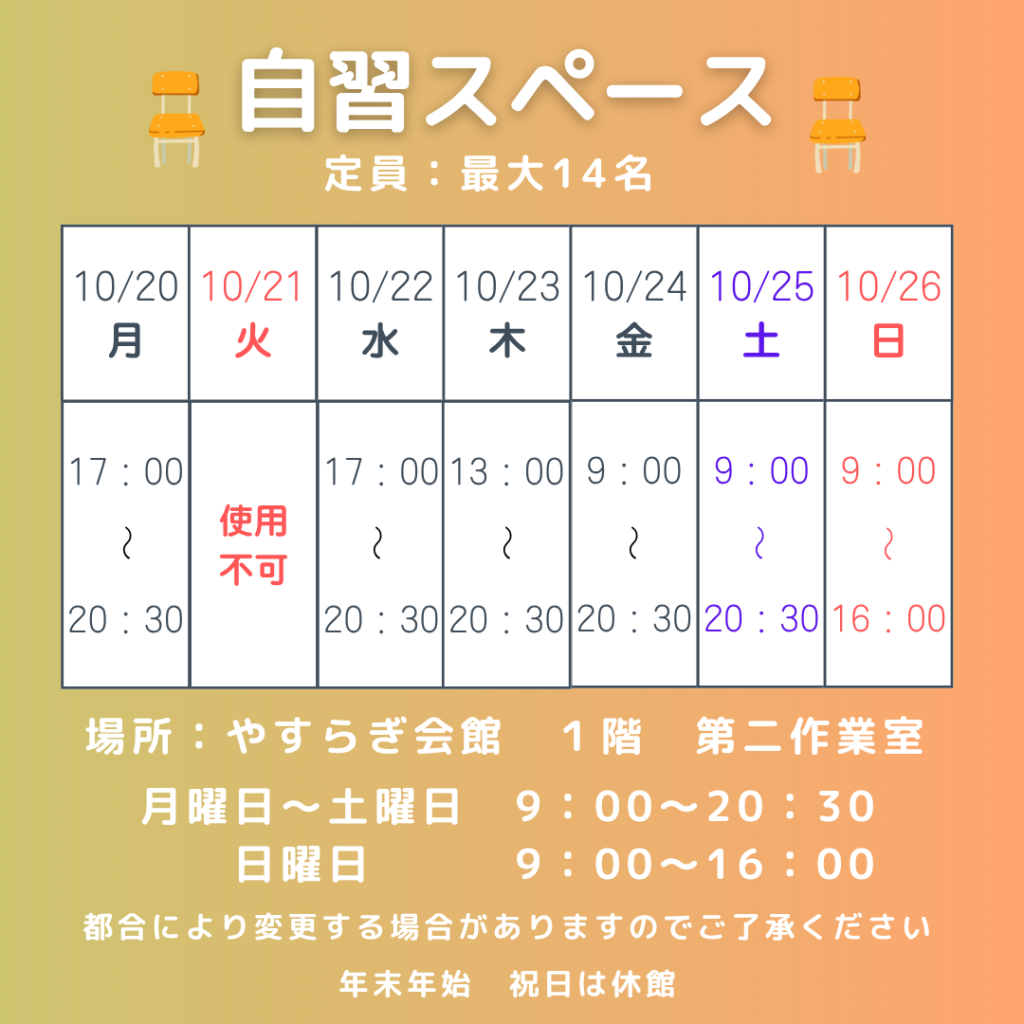 10/20~10/26の自習スペース利用のご案内です。読書や自習時間としてご利用ください。