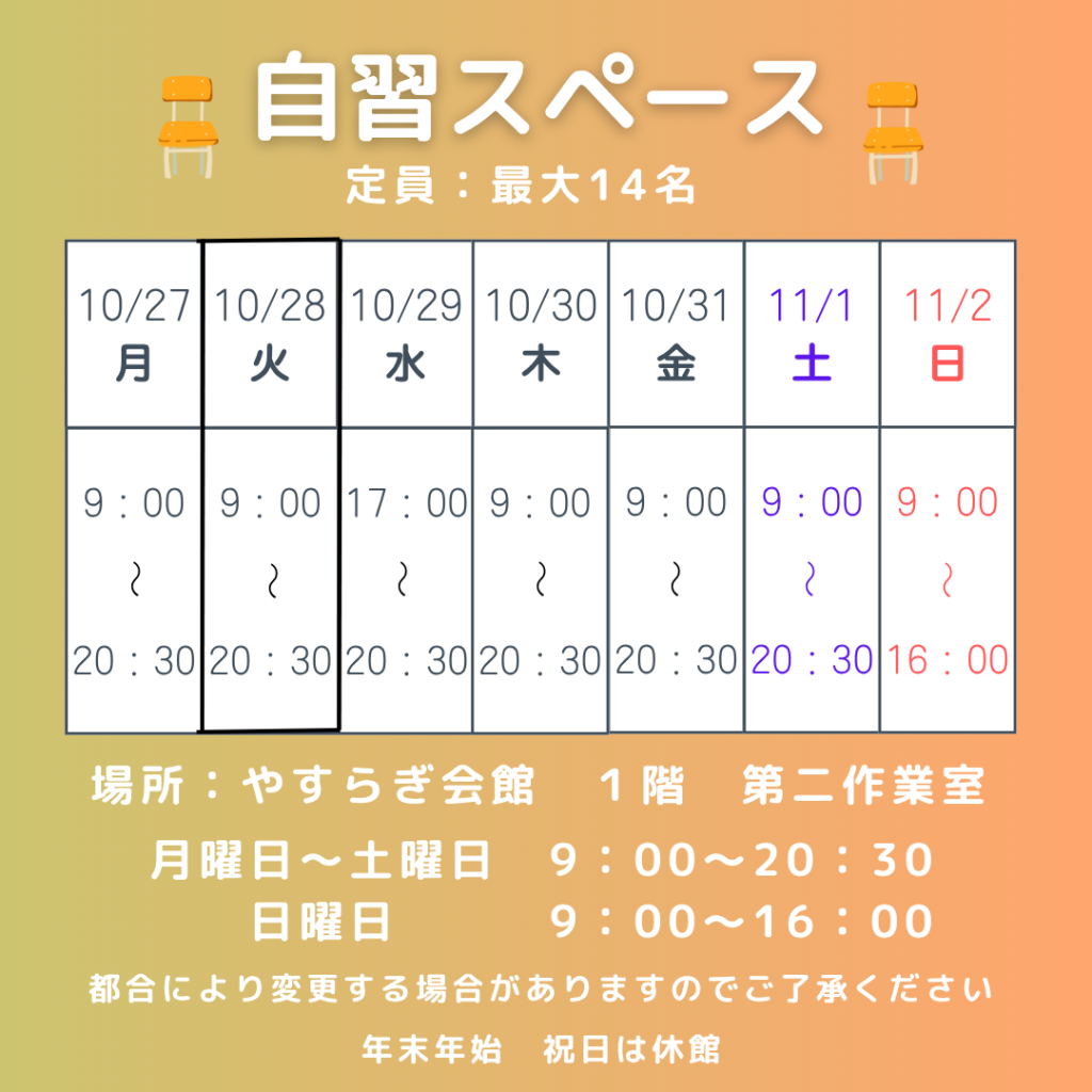 10/27~11/2(1週間分)の自習スペース利用のご案内です。読書や自習時間としてご利用ください。