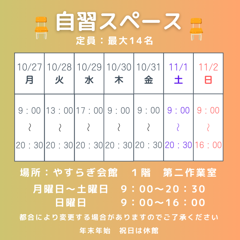 10/27~11/2の自習スペース利用のご案内です。読書や自習時間としてご利用ください。