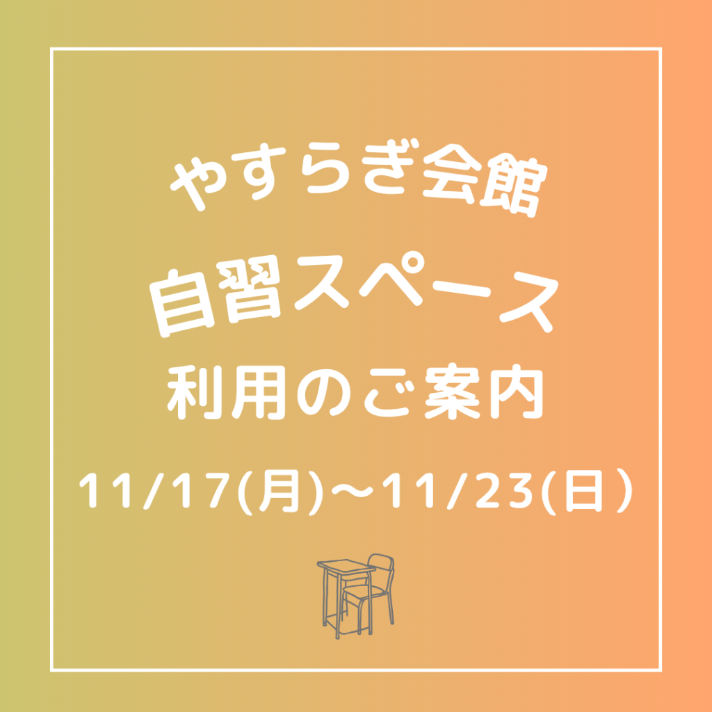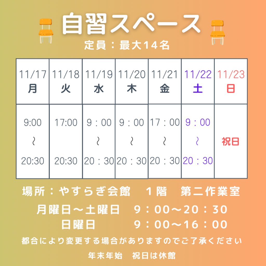 11/17~11/23の自習スペース利用のご案内です。読書や自習時間としてご利用ください。