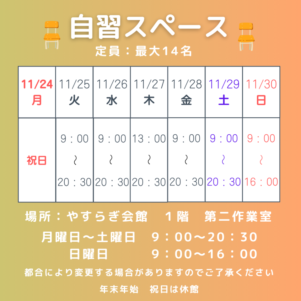 11/24~11/30の自習スペース利用のご案内です。読書や自習時間としてご利用ください。