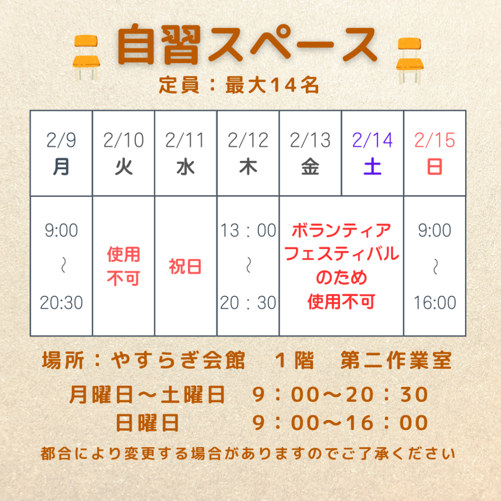 2/9~2/15の自習スペース利用のご案内です。読書や自習時間としてご利用ください。